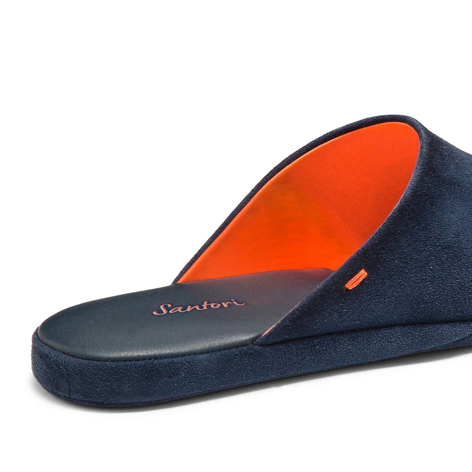 Queste pantofole, perfette come idea regalo, sono state pensate come un accessorio di lusso da infilare nel tuo kit da viaggio. Sono realizzate in pregiata pelle scamosciata e impreziosite da un delicato ricamo Arancio Santoni. Infine, presentano una suola leggermente ammortizzata per garantire un comfort impeccabile. Comode e leggere, si ripongono facilmente nell’apposita pochette con cerniera stampata con il logo.